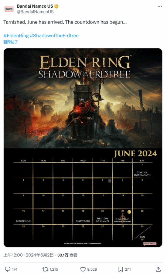 今年上半年,万代南梦宫正式公布了《艾尔登法环》DLC“黄金树之影”的预告,并表示其将会在6月21日正式推出。而今日距离该DLC发布已不到一个月的时间,万代南梦宫发布了“黄金树之影”的日历版倒计时图,我们一起来看一下。