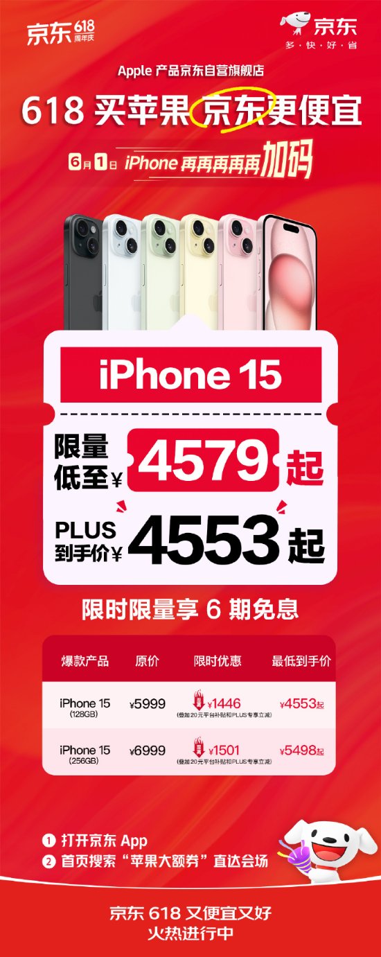 在Apple京东自营旗舰店里,iPhone 15系列限量低至4579元起,PLUS会员最低到手4553元起。此外还有限时限量享6期免息的活动。