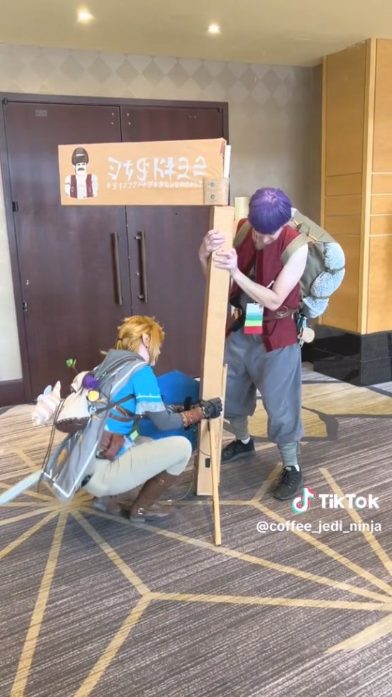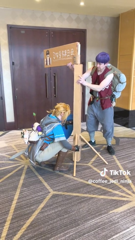 Tiktok博主coffee_jedi_ninja就分享了其Cos卡邦达然后遇到了Cos林克的玩家帮其固定广告牌的视频。