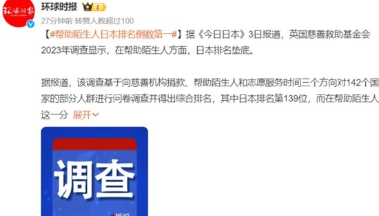 据环球时报报道,英国慈善救助基金会2023年调查显示,在帮助陌生人方面,日本排名垫底。