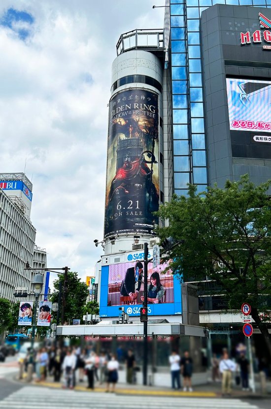 为了迎接即将到来的DLC,FromSoftware公司在日本涩谷忠犬八公雕像前广场为《艾尔登法环:黄金树幽影》打了广告,大型竖立户外广告牌特别亮眼,一眼就可以看到。