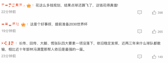 有人调侃表示:“花这么多钱规划,结果点球还踢飞了,这钱花得真值!”“这是个好事呀,提前准备2030世界杯。”“真想国足出线,还不如希望新加坡最后一场赢了泰国来得实际。”