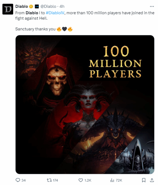 《暗黑破坏神》官方宣布,从《暗黑1》到《暗黑4》,已经有超过1亿名玩家加入到了对抗地狱的战斗中,庇护之地感谢你们。
