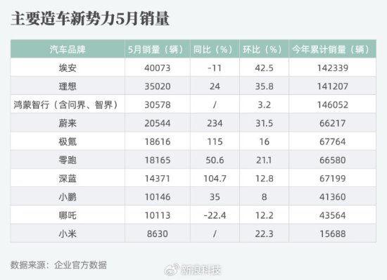 5月新势力销量集体回暖 蔚来和极氪创历史新高