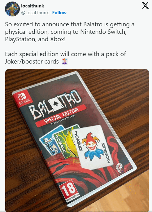游戏创始人LocalThunk在推特宣布了这一消息:“非常高兴地宣布《小丑牌》将推出实体版,登陆Nintendo Switch、PlayStation和 Xbox。每个特别版都会附带一个卡包。