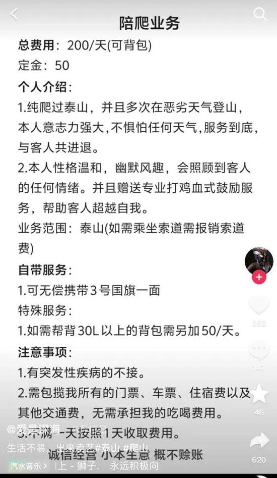 “我在网上发了‘陪爬’泰山的帖子,每单收费200元。”5月底,有过2次登顶泰山经验的付同学,跟风发布了“陪爬”帖子。5月31日,第一位顾客董女士的闺蜜联系到了付同学,雇他陪同爬泰山。