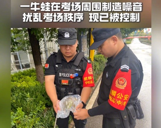 据巨浪视频报道,6月8日,罗平警方发视频,一牛蛙在考场周围制造噪音,扰乱考场秩序,现已被控制。被网友评为“今年高考最好笑的一个”。