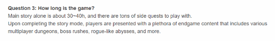 单是主线剧情就有30~40小时,还有大量的支线任务。在完成故事模式后,玩家将看到大量的终局游戏内容,包括各种多人内容、BOSS挑战、类似Roguelike的深渊等。