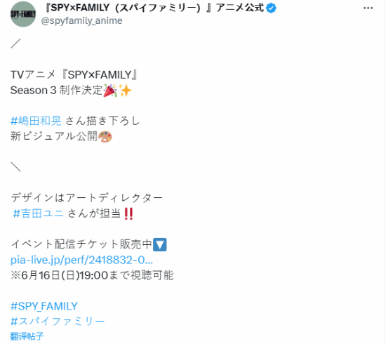 今日《间谍过家家》官方宣布,TV动画《间谍过家家》第三季正式开始制作!与此同时,官方还放出了以《间谍过家家》角色阿尼亚为主题的新视觉图,我们一起来欣赏一下。