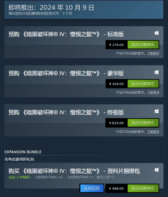 标准版售价278元、豪华版售价418元、终极版售价623元。另外,《暗黑破坏神4:憎恨之躯》的资料片捆绑包售价488元。