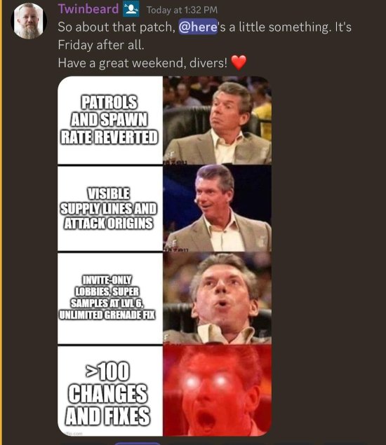 此前《地狱潜者2》社区经理Twinbeard曾表示未来将放缓更新速度,并优先更新质量。据外媒gamingblot报道,近日该名社区经理又在Discord里发文透露,《地狱潜者2》的下一个补丁将会为游戏带来100多项的更改,并包括一系列的Bug修复,我们一起来看一下。