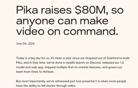 本轮融资由Spark Capital领投,Greycroft、Lightspeed Venture Partners以及Jared Leto参投。此轮融资后,Pika总融资额已达1.35亿美元,估值将超过4.7亿美元(约合人民币34亿元)。