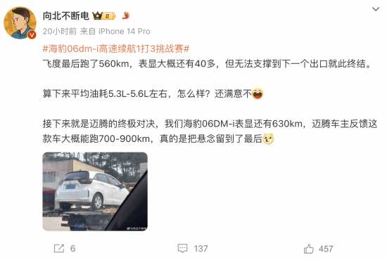 至于此次测试的最终结果,悬念就留在了迈腾身上,有迈腾车友表示,66L油箱的迈腾高速续航在700-900km左右,而目前海豹06 DM-i表显续航还有630km。