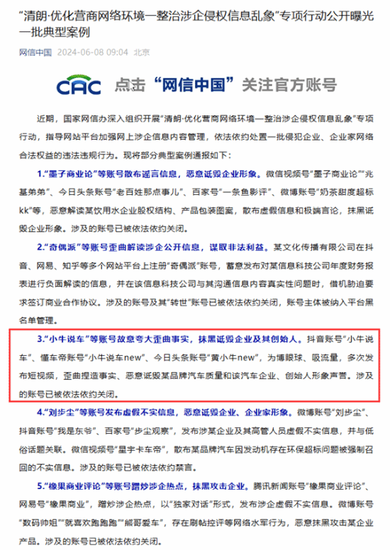 “网信中国”发布了《“清朗·优化营商网络环境一整治涉企侵权信息乱象”专项行动公开曝光一批典型案例》,其中提到了“小牛说车”被封的情况。