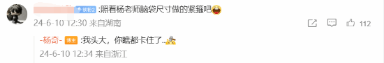 在回应网友评论时,杨奇还表示:“我头大,你瞧都卡住了..”。