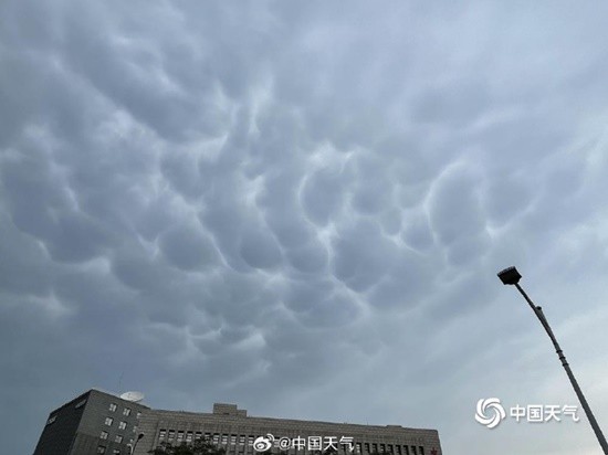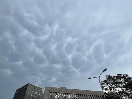 据中国天气报道,6月10日午后,雷雨云团影响北京,北四环附近天空出现乳状云。