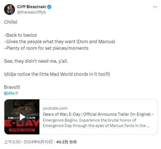 而在今年早些时候表示准备以创作者的身份“离开”《战争机器》系列的系列开创者,Cliff Bleszinski对这部自己参与程度不高的新作十分看好,表示预告片做到了返璞归真,并且让呼声颇高的多姆和马库斯回归,预告片中的环境也具有“足够的空间来放置布景/时刻”。表示制作组不需要他(也能做出好作品)。