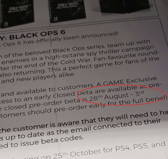 日前,数据挖掘博主BobNetworkUK发布了一张照片,其中显示《使命召唤21:黑色行动6》的预购用户将在8月28日至9月3日期间,获得游戏早期测试的访问权。随后,测试将面向全体玩家开放。这张照片来自于英国零售商Game的员工。