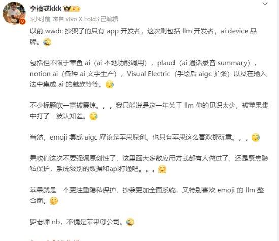 魅族前高管李楠看完整场发布会也是第一时间吐槽称,“以前wwdc抄哭了的只有app开发者,这次则包括llm开发者,ai device品牌,以及在输入法中集成ai的魅族等等。”