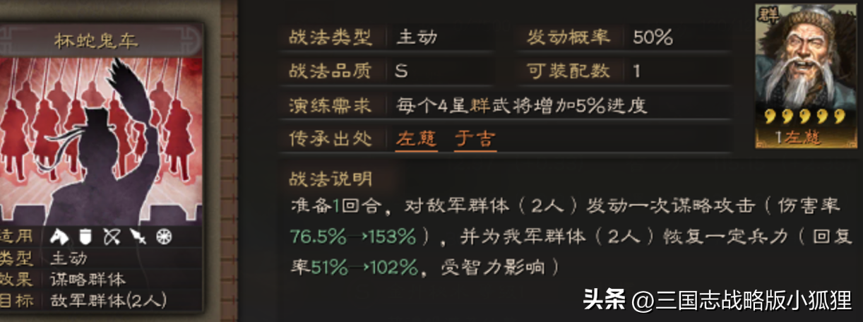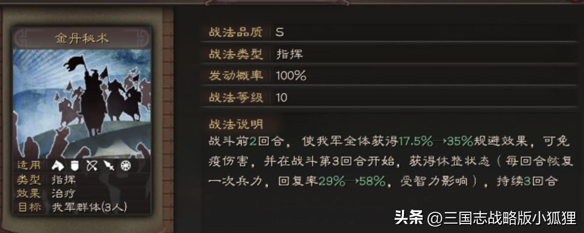 分析:左慈的自带战法非常强,其战法最核心的有两大块,一个是规避(这个运气好直接就免伤了,还是全体),一个是治疗而且还持续3回合。