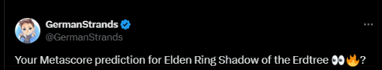 距离《艾尔登法环:黄金树幽影》发售还有六天时间。近日,推主GermanStrands发起评分预测,不少玩家都纷纷给出高分(90以上)相信FromSoftware就是品质的保证。