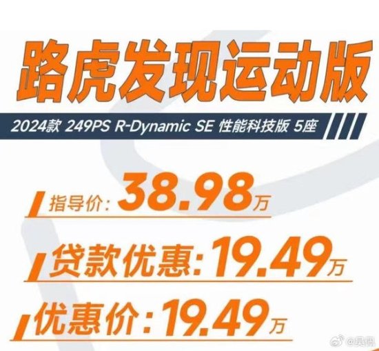 根据汽车博主放出的报价图片,路虎发现运动版2024款249PS R-Dynamic SE性能科技版5座的官方指导价为38.98万元,选择贷款可优惠19.49万,也就是说,贷款方案的裸车优惠价为19.49万。