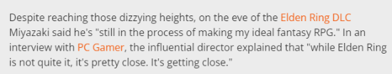 他说到:“虽然《艾尔登法环》还没有达到理想的高度,但也非常接近了。”