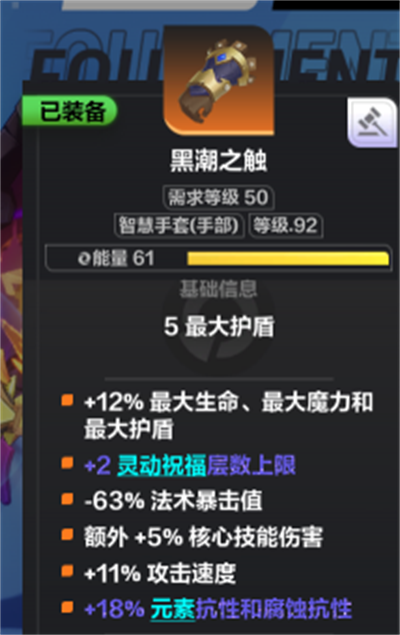 装备:【黑潮之触】,最低要求+1的灵动祝福,词条只需要不减少攻速和施法速度的都可以。