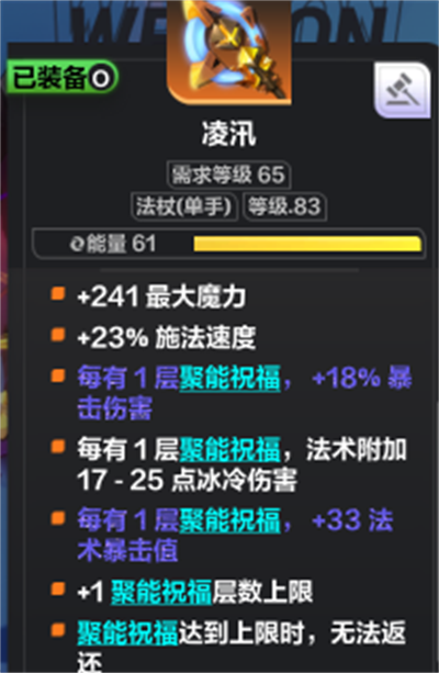 装备:【凌汛】普通即可,可以适当添加能量上限词条。