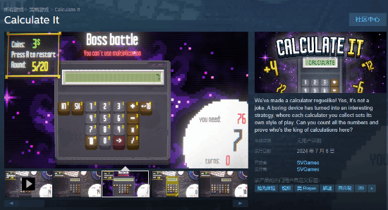 由SVGames开发与发行的类Rogue模拟游戏《Calculate It》将于今年7月6日在Steam进行抢先体验。玩家需要用手中的计算器算出特定数字才能过关,但按键与计算次数是有限的,BOSS战甚至还会禁用算法。玩家在获得金钱后则可以在商店购买新按键、升级或扩大尺寸,感兴趣的玩家可以点击下方地址查看。