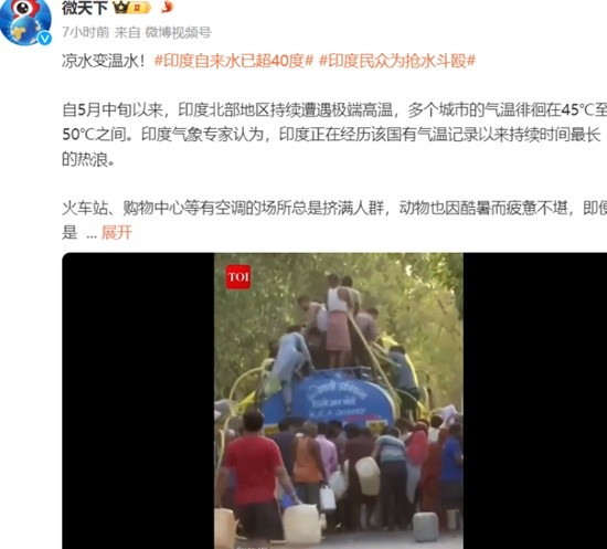 火车站、购物中心等有空调的场所总是挤满人群,动物也因酷暑而疲惫不堪,即便是水龙头里流出的水都已经超过了40℃。印度首都新德里出现用水危机,当地民众取水时发生斗殴。