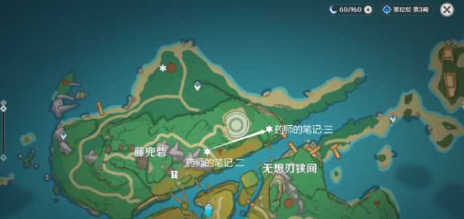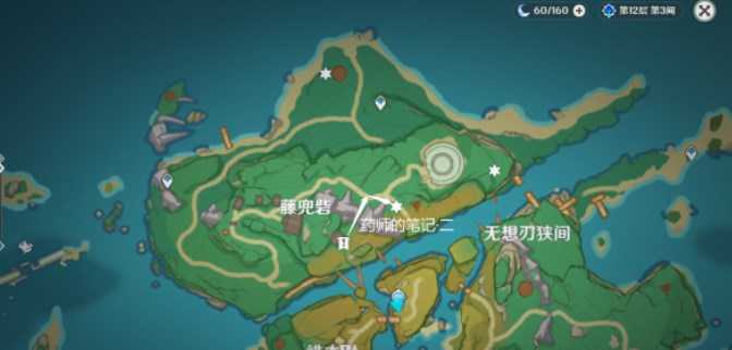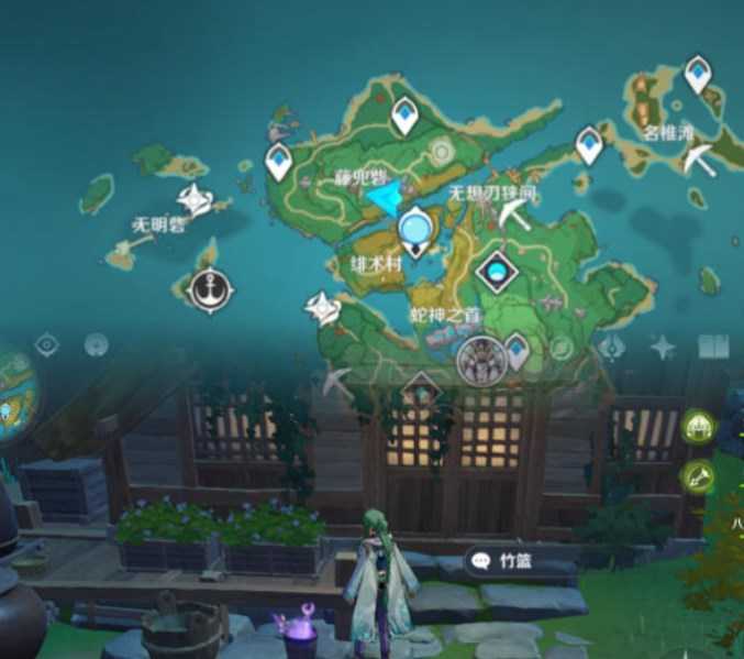 4、集齐三本笔记,获得成就「游医的奥德赛」,然后传送蛇骨矿洞南方向锚点,面朝地图的南方向,可以看到竹篮和宝箱。