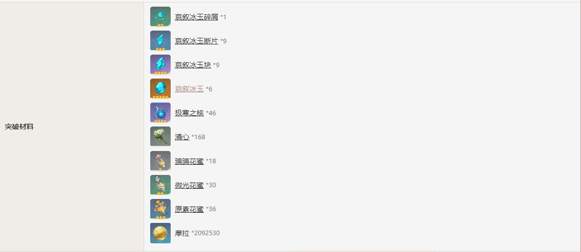 6. 80级突破材料:120000摩拉、哀叙冰玉6个、极寒之核20个、清心60个、原素花蜜24个