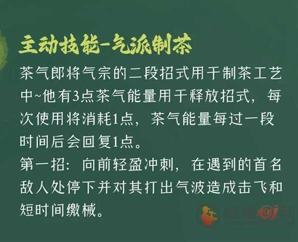 他有3点茶气能量用于释放招式,每次使用将消耗1点,茶气能量每过一段时间后会回复1点。