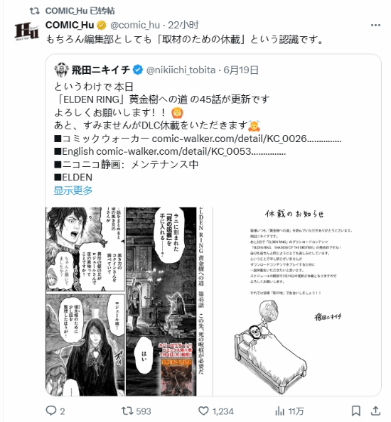 另外值得一提的是,飛田ニキイチ此前宣布将暂停连载,请假理由则是因为“DLC要发售了,所以我摸了。”而COMIC_Hu编辑部也在不久前转发了请假推文,认可这是为了取材而暂停连载的,予以批准。