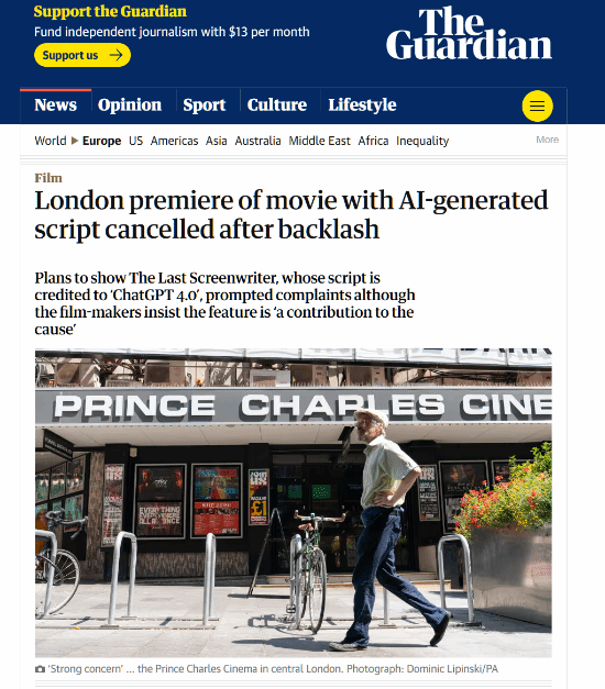 据《卫报》当地时间周四报道,在遭到强烈反对后,伦敦一家电影院取消了号称是“首部”(未说明是否全球首部)AI制作的电影的英国首映式。