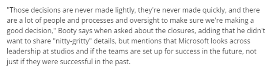 马特·布蒂没有分享“具体”的细节,不过他表示微软会全面审视这些工作室的领导力,以及团队是否为未来的成功做好了准备,而不仅仅依据他们过去的辉煌成就。他表示:“这取决于很多因素,例如领导力、创意水平,团队现阶段的成员是否与过去推出过成功作品的是同一批人,是否能延续成功。这些决定从来都不是轻率做出的,我们需要很多人力、很多流程和监督来确保我们做出正确的决定。”