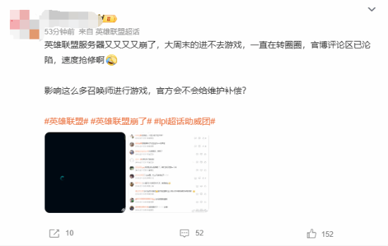 今日有多名网友在微博反映自己连不上《英雄联盟》服务器,具体表现为在页面一直“转圈”。截至发稿前,“英雄联盟崩了”已登至微博热搜榜12名。
