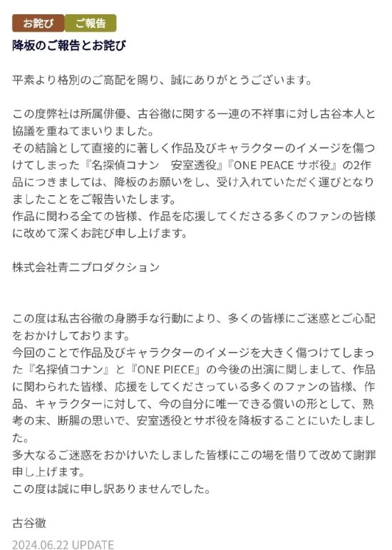 古谷彻表示:此次由于我的自私行为,给许多人带来了困扰和担忧。本次事件大大损害了作品及角色的形象,关于未来我在《名侦探柯南》和《海贼王》中的出演情况,经过深思熟虑后,为了弥补对作品和角色造成的伤害,作为唯一能够表达我歉意的方式,我决定痛下决心辞去安室透和萨博的角色。对于给各位带来的巨大困扰,我在此再次表示诚挚的歉意。对此我深感抱歉。