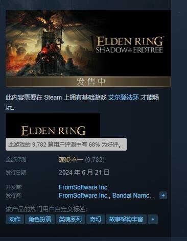 截至今天下午,Steam平台上关于“黄金树幽影”的评价已经跌至褒贬不一。在9782篇用户评测中,好评率仅为68%,相比昨日已经有了显著下降。
