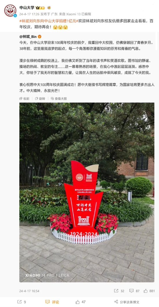 4 月 17 日下午,林斌、刘向东夫妇向中山大学捐赠签约仪式在中山大学举行,林斌、刘向东夫妇向母校捐赠现金 1 亿元人民币。根据公开信息,中山大学将于今年 11 月 12 日迎来百周年校庆。林斌当时表示,自己在中山大学迎来百年校庆的前夕重回校园,仿佛穿越回青春岁月;38 年前(1986 年),这里曾是自己追梦的起点。