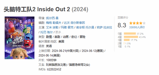 截至发稿前,《头脑特工队2》的豆瓣评分为8.3分,共有33066人参与评价,其中打5星与4星的影迷居多,分别为37.2%与43.4%。