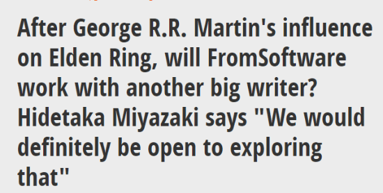 《艾尔登法环》因《权力的游戏》作者乔治·R·R·马丁对游戏背景和史诗故事的贡献而备受瞩目。近日,游戏制作人宫崎英高在接受GameSpot采访时表示,未来他“绝对愿意”和继续其他知名创作者合作。