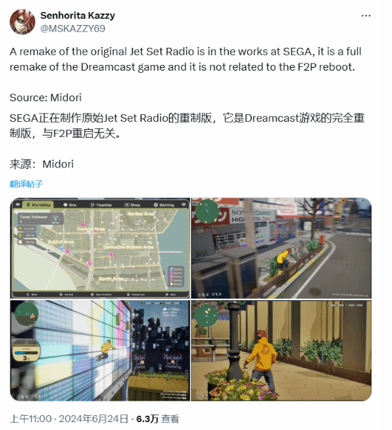 近日,有传言称世嘉正在开发《街头涂鸦》(Jet Set Radio)原作的重制版,该作是与官方宣布的系列重启项目彼此独立的另一个项目。相关截图已在网上曝光。