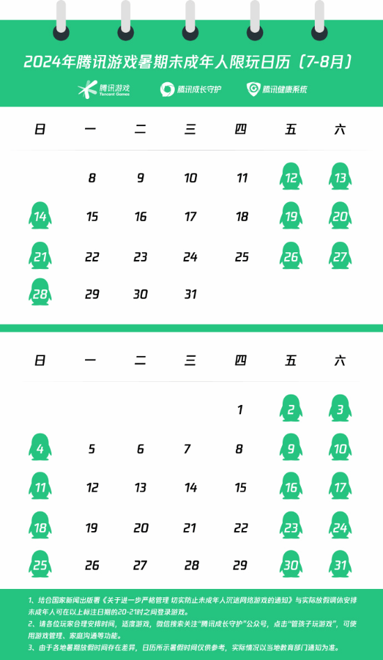 腾讯发布暑期未成年人限玩日历:总时长不足24小时