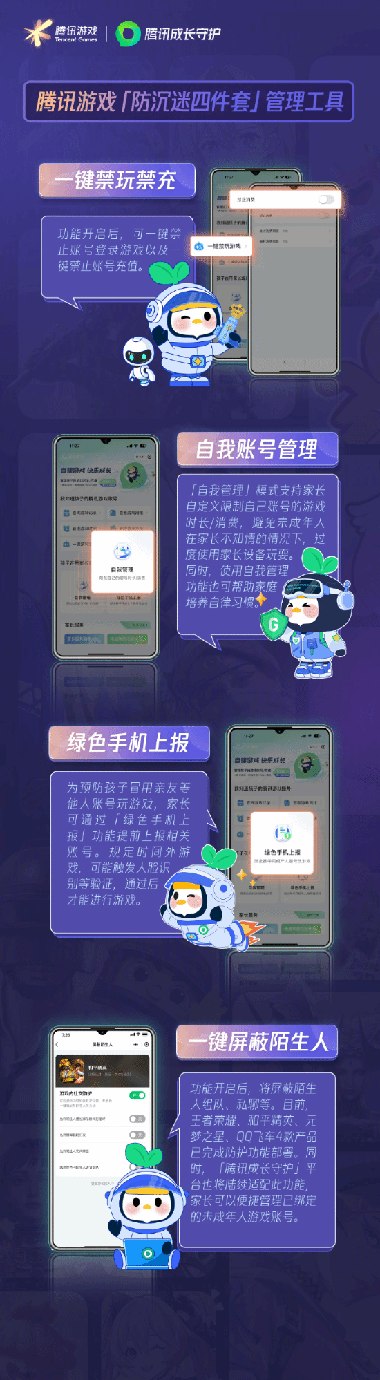 此外,腾讯也给家长用户提供“防沉迷四件套”管理工具和家长服务助手,协助家长便捷高效管理孩子游戏行为。“防沉迷四件套”涵盖“一键禁玩禁充”“自我账号管理”“绿色手机上报”以及“一键屏蔽陌生人”四大功能。