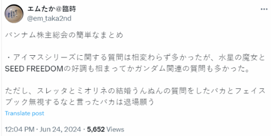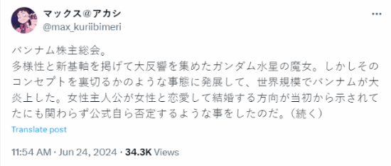 万代股东开会公然叫板高层 为水星的魔女女同CP正名