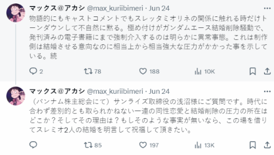 当时《高达ACE》最新一期杂志记录了苏莱塔声优的一段采访:“看到苏莱塔与米奥琳涅两人都带着戒指,相信观众们也都松了一口气吧……看到她们结婚后的样子真的很感动。”这句从官方人员嘴里说出来的话基本上确认了两位女主结婚的事实。但官方在杂志发售的两天后,将采访中“结婚”的字眼删掉了,进而引发了粉丝们的愤怒,质疑高层是迫于同性婚姻的舆论压力而进行了删改,否认了两位女主的关系。