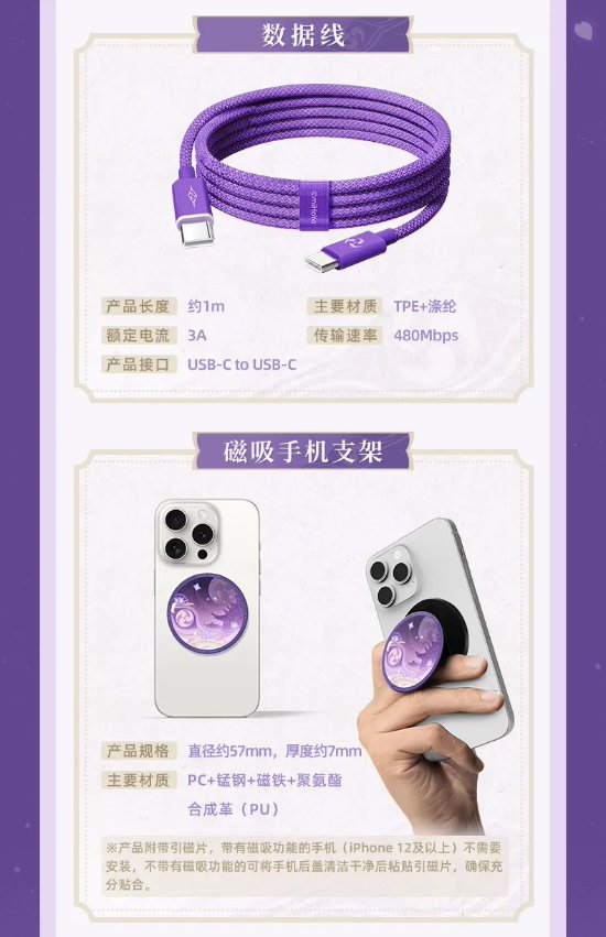 其中,移动电源的图案采用一体注塑开模工艺,数据线为紫色编织线身,手机支架为磁吸设计,手机夹片挂绳有字母款和表情包款两种选择。