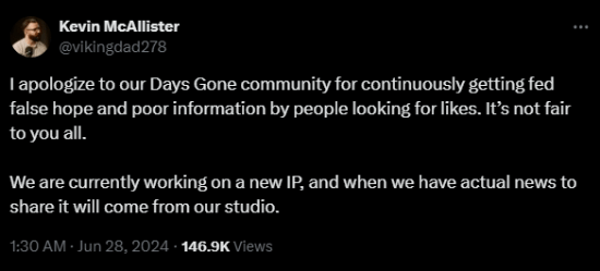 他在推文中表示:“我向我们的《往日不再》社区道歉,因为那些为了点赞(热度)人不断地向我们灌输虚假的希望和糟糕的信息。这对你们所有人都不公平。我们目前正在开发一个新IP,当我们有实际消息要分享时,工作室会发布的。”